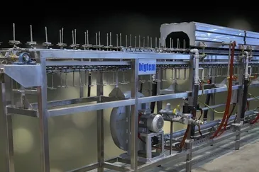 VegTech Systems offers the advanced Rod Type Roaster, manufactured by Bigtem Makine. This stainless steel machine is designed for roasting cored peppers and vegetables, loaded onto 100mm height stainless steel studs eccentrically installed on dual chain tracks with 100mm spacing. These product holders transport items through a high-temperature flame tunnel for uniform charring and flavor enhancement.